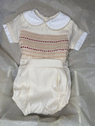 The hand-smocked detailing across the front features cream and red threads. This design also comes in a matching girls dress.