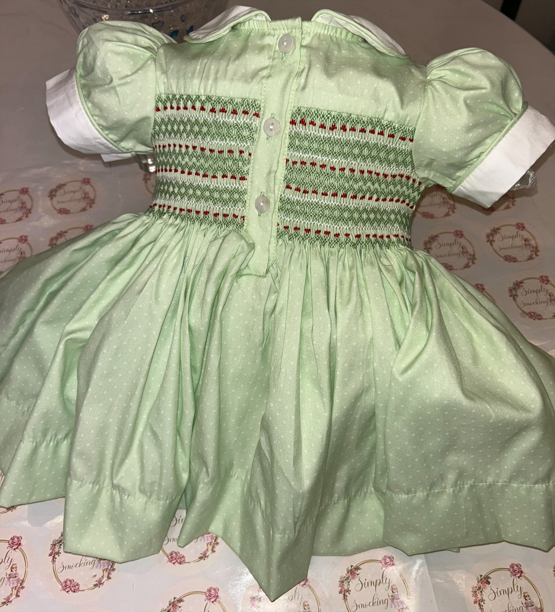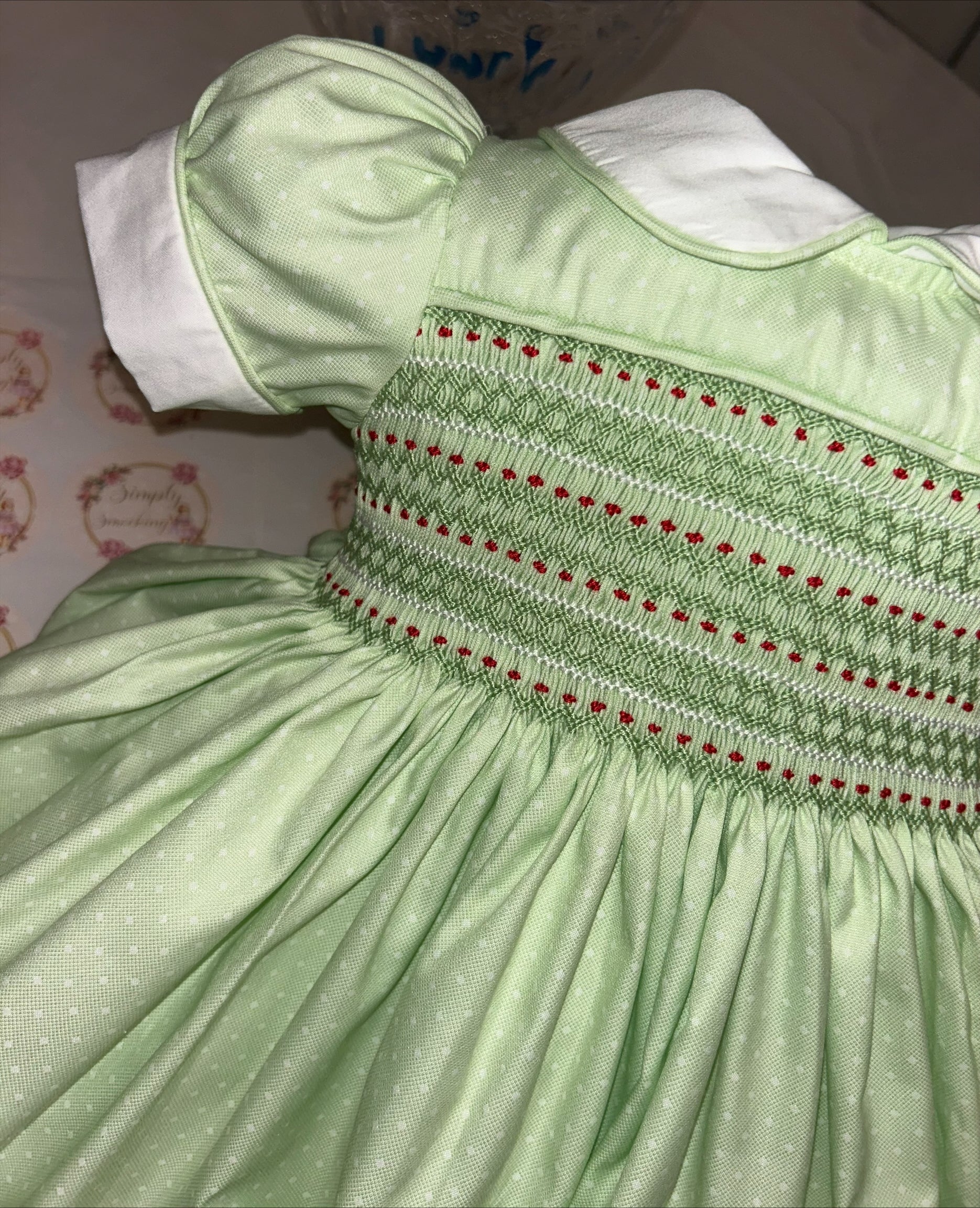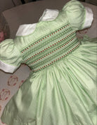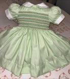 Smocked back and front with knickers, bows (headband for smaller sizes) and a thick fitted petticoat.