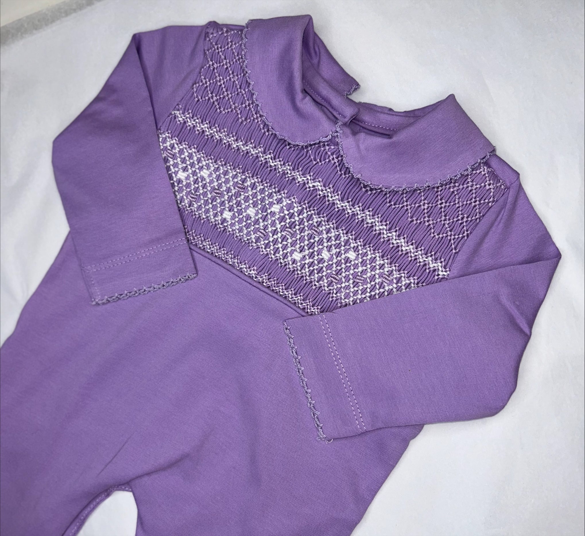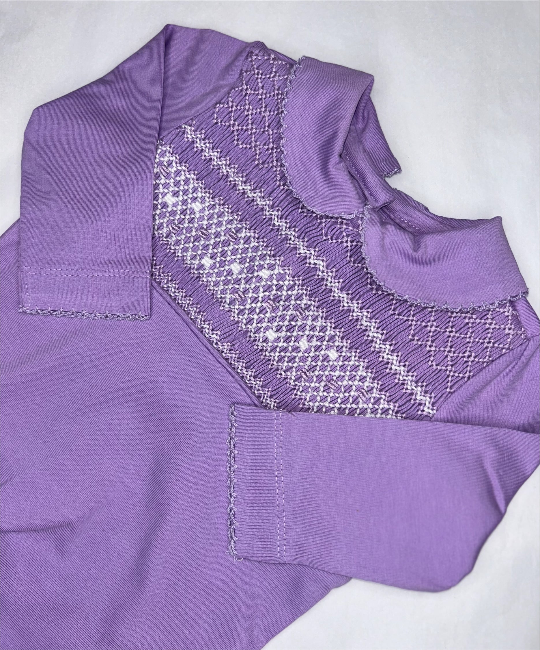 Beautiful soft pima cotton with purple and white smocking.