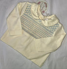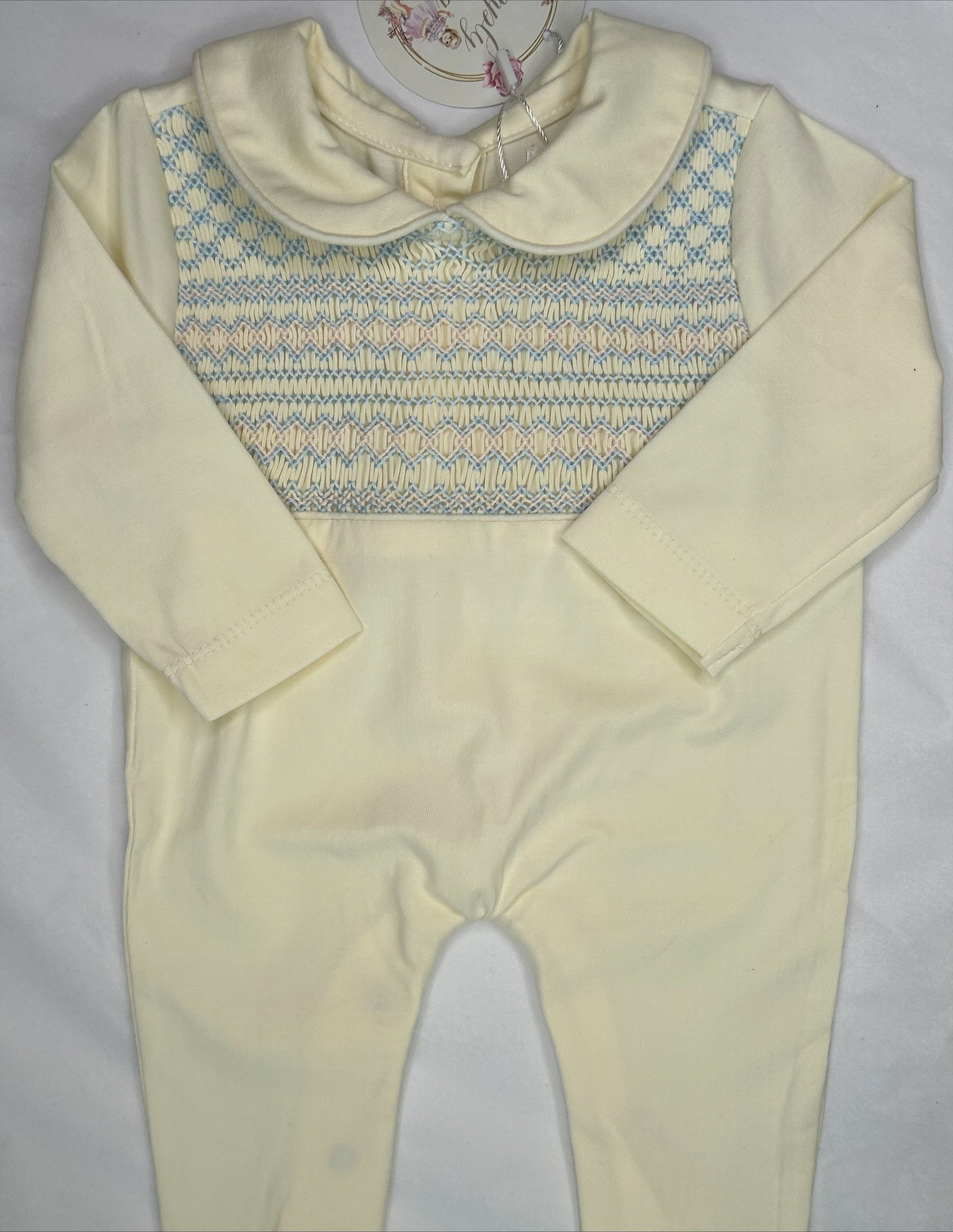 Creamy lemon hand smocked babygrow in the softest pima cotton.