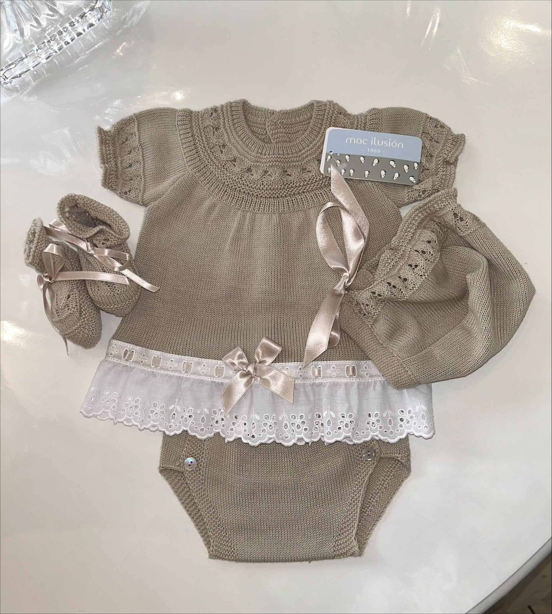Stunning 4 piece set consisting of top, bottoms, booties and bonnet.