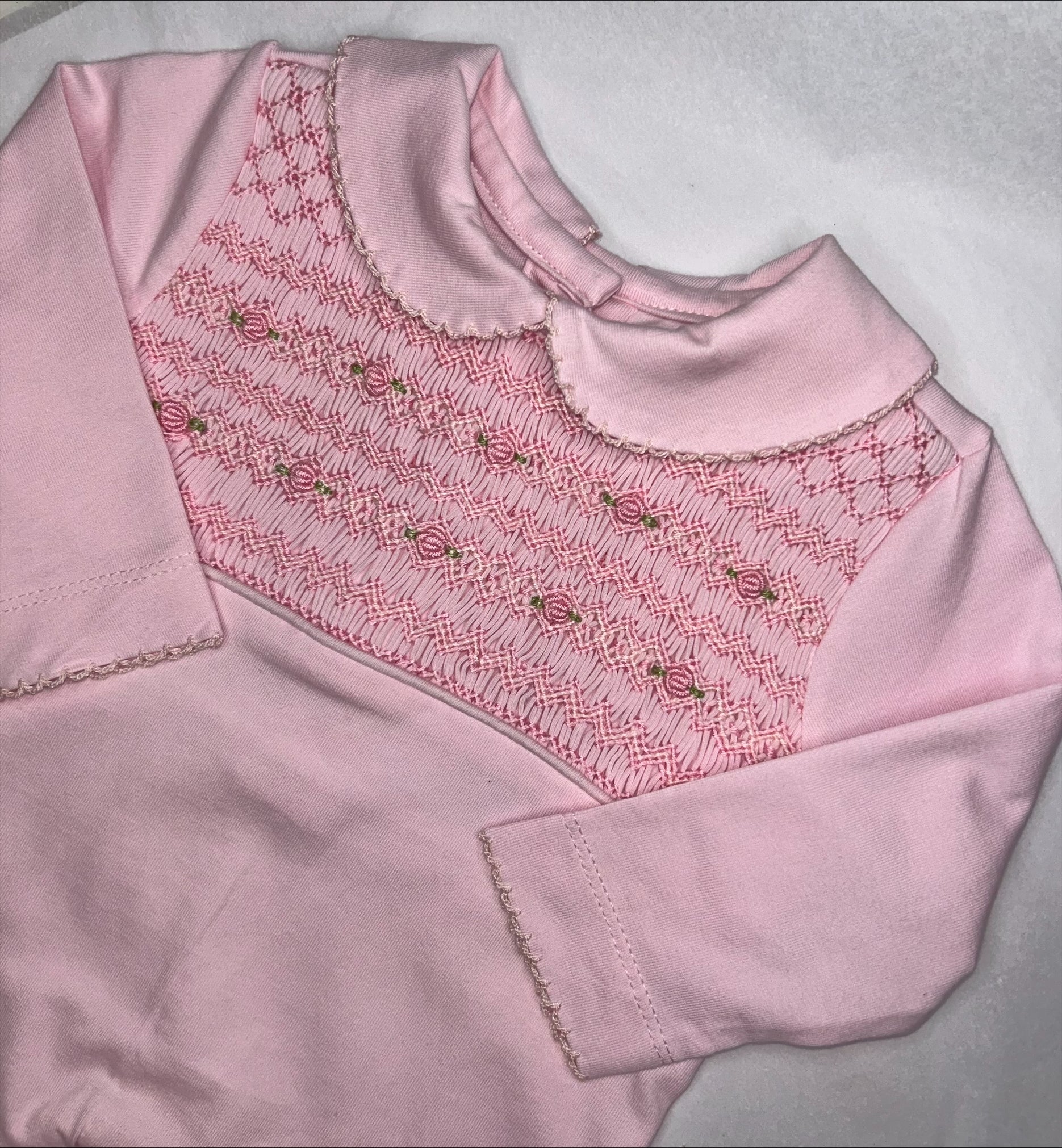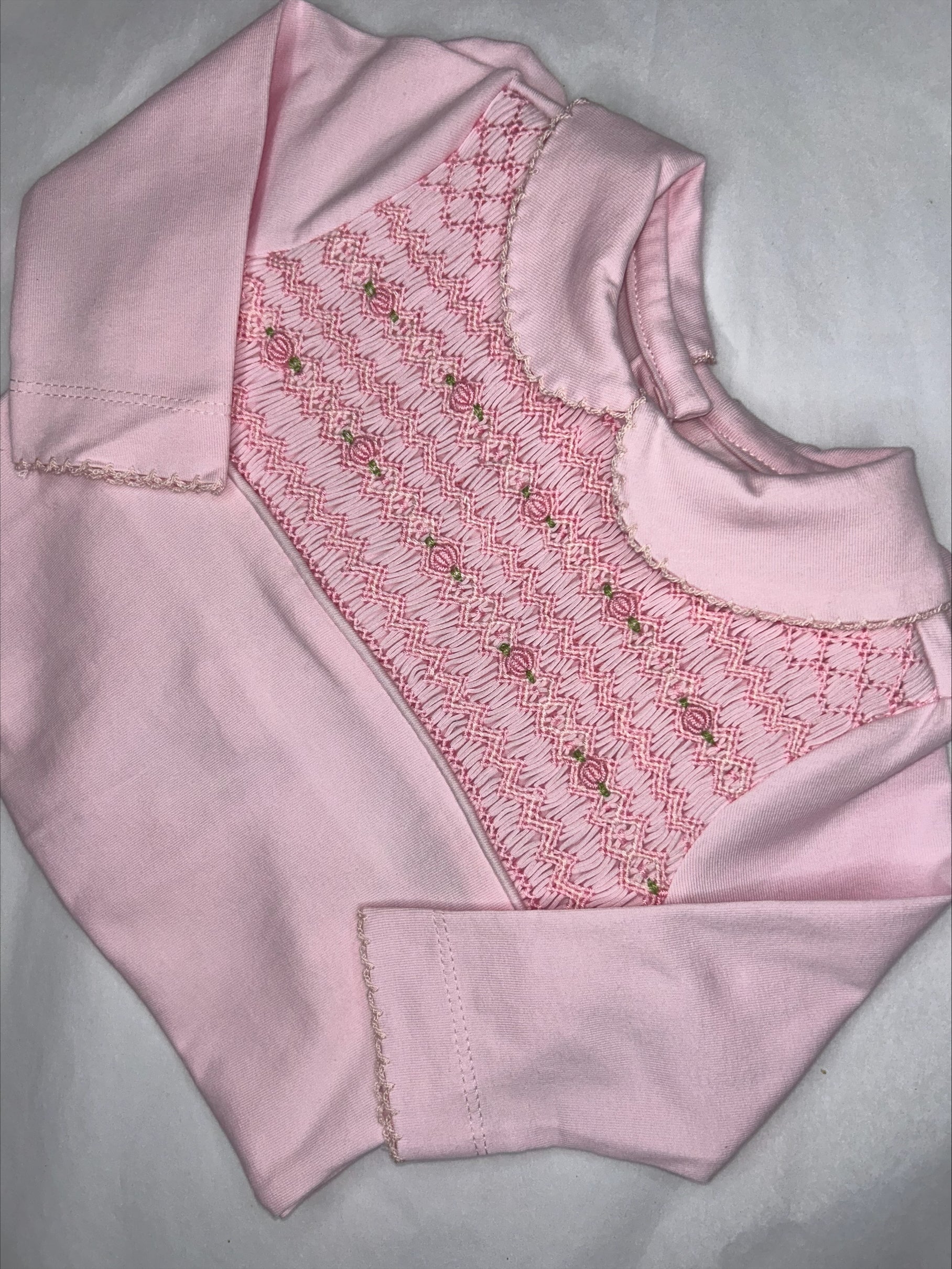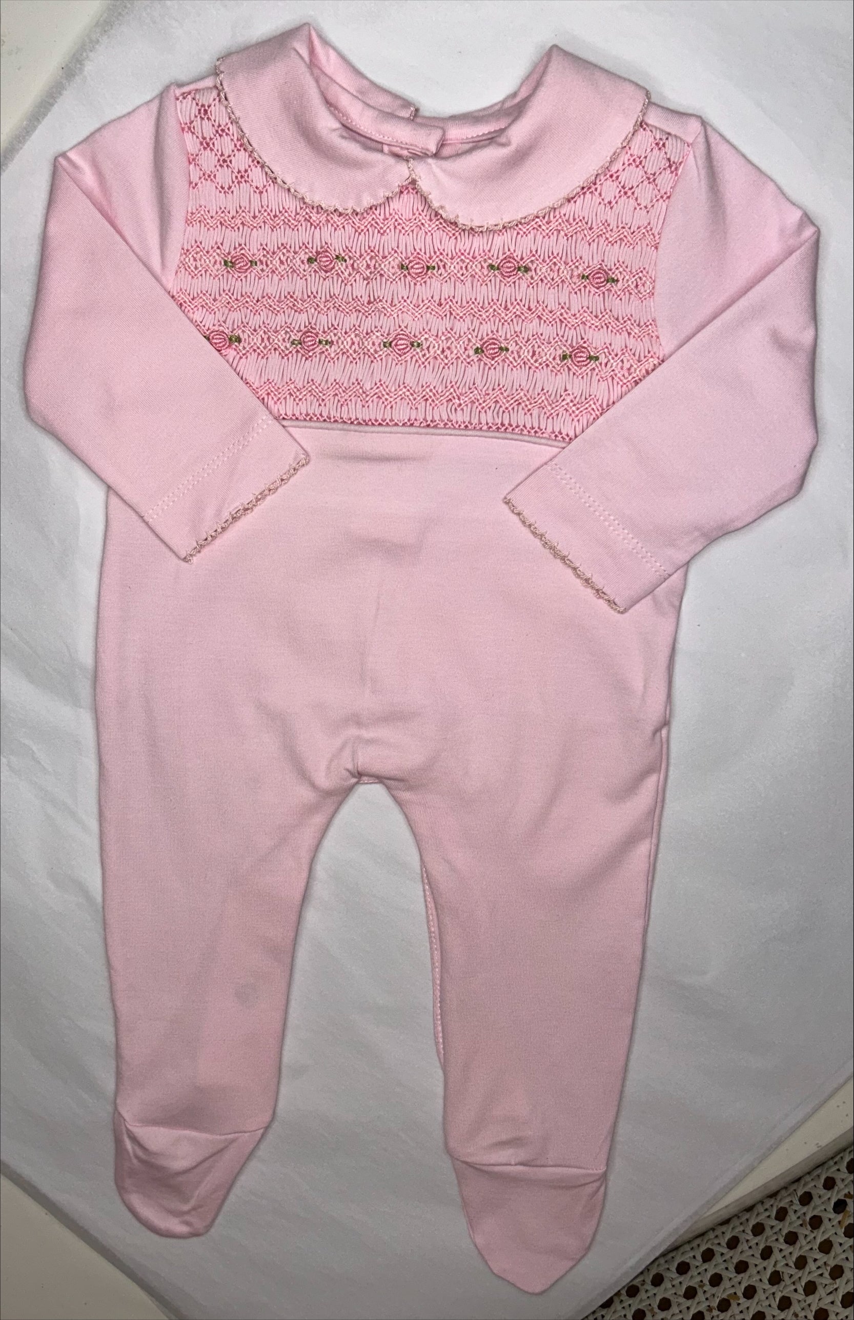 Beautiful soft pima cotton hand smocked babygrow with rose detailing on the smocking.